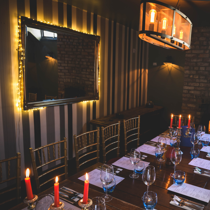 The Albion’s beautiful upstairs dining room, with a fully stocked private bar, table service throughout and the kind of atmosphere that makes an occasion feel truly special.